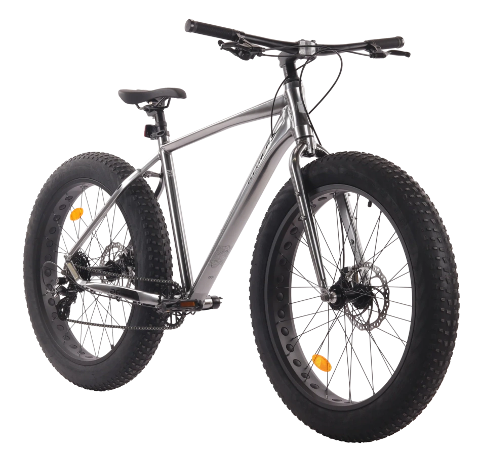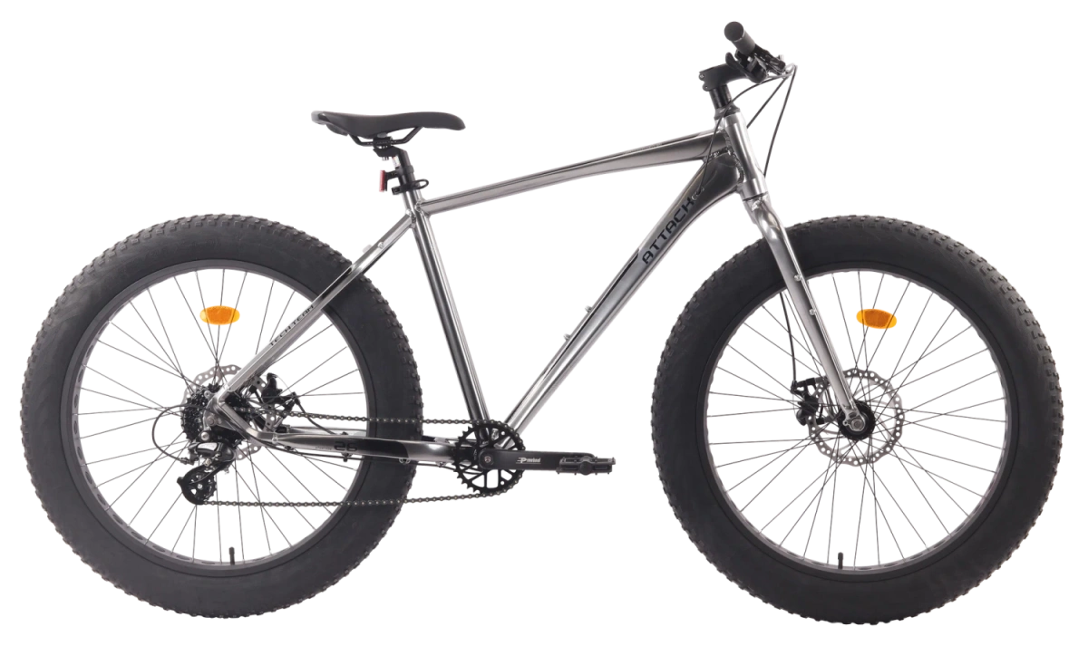 Велосипед с широкими покрышками (фэтбайк) и оборудованием начального любительского класса Shimano, 8 скоростей.