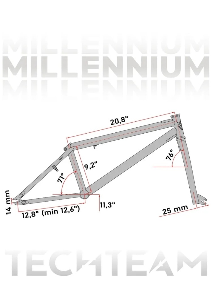 БМХ Millennium обладает эталонной геометрией рамы, произведенной с использованием самых лучших технологий и технических решений индустрии. Вместо хайтена для производства рам и вилок используются горячекатанные трубы из специального стального сплава. Дропауты под 14мм ось выполнены по технологии investment cast c низкотемпературной пайкой, ширина 7.5 мм, кареточный узел под систему MID и рулевая труба, - фрезерованные для получения максимальной точности для установки подшипников и высокой прочности. Задний треугольник длиной 12,7" позволяет установить покрышки шириной 2,4 дюйма. Заведенные перья усилены мостиками для большей жесткости рамы. Изменения коснулись креплений тормозов, теперь они выполнены съемной конструкции как на перьях, так и на верхней трубе. Вилка имеет конусные ноги с выбегом 25мм с баттированный шток под топ-кэп.